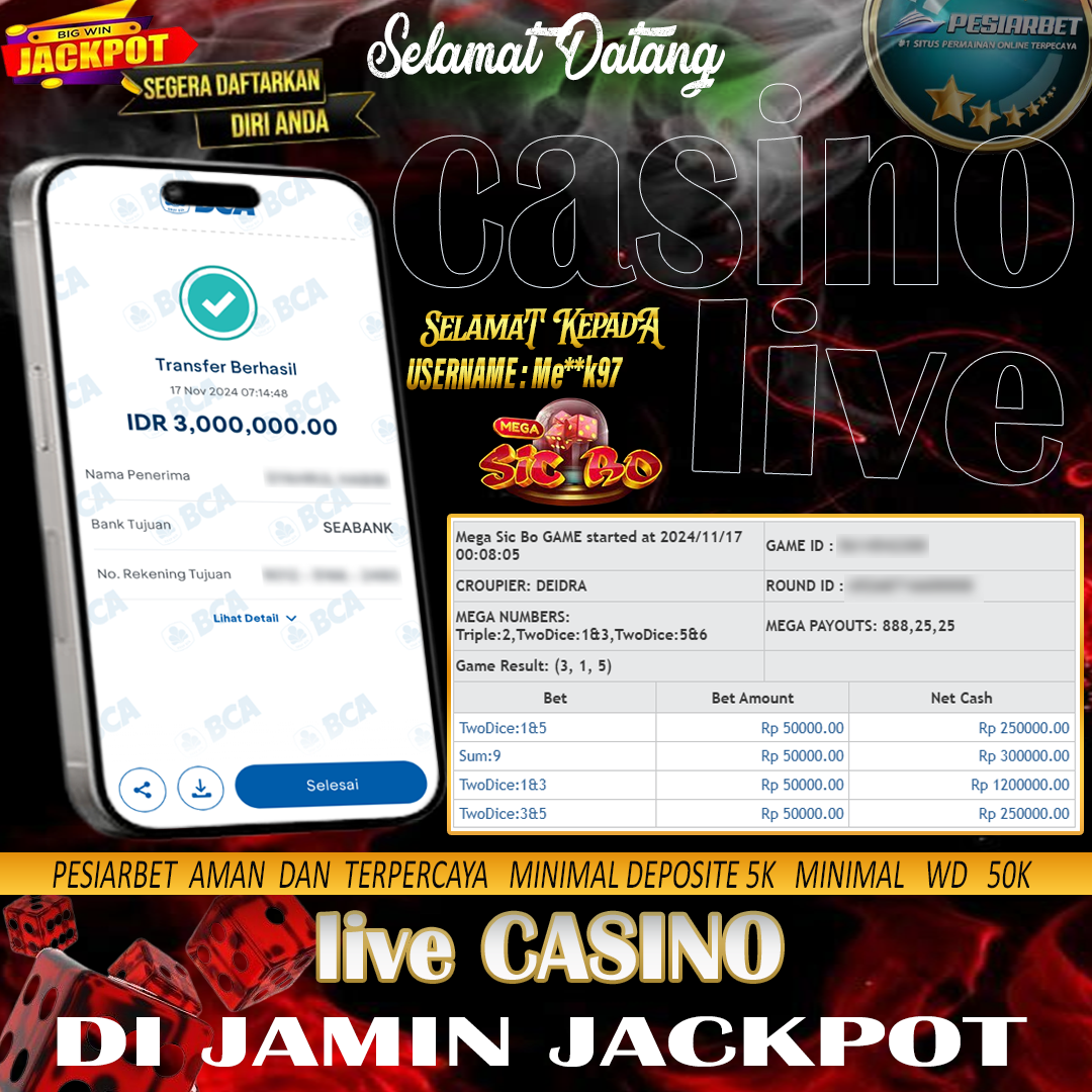 PESIARBET Bukti Kemenangan Live Casino MEGA SIC BO