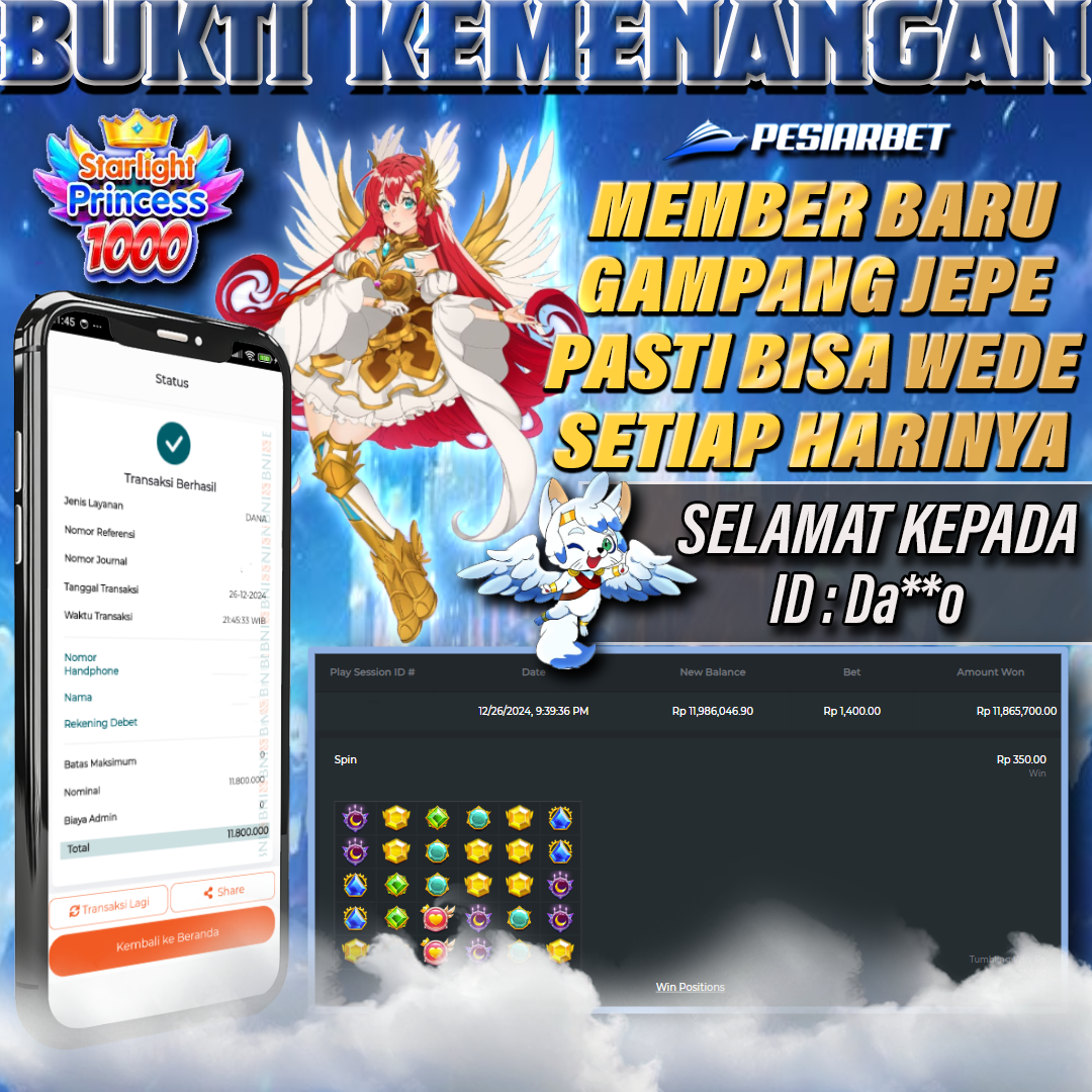 Selamat Kepada Id : Da**o*di Atas Withdraw Rp 11,800,000 Juta Hari ini. Ditunggu Withdraw Selanjutnya dan ajak juga teman temannya bergabung di Pesiarbet